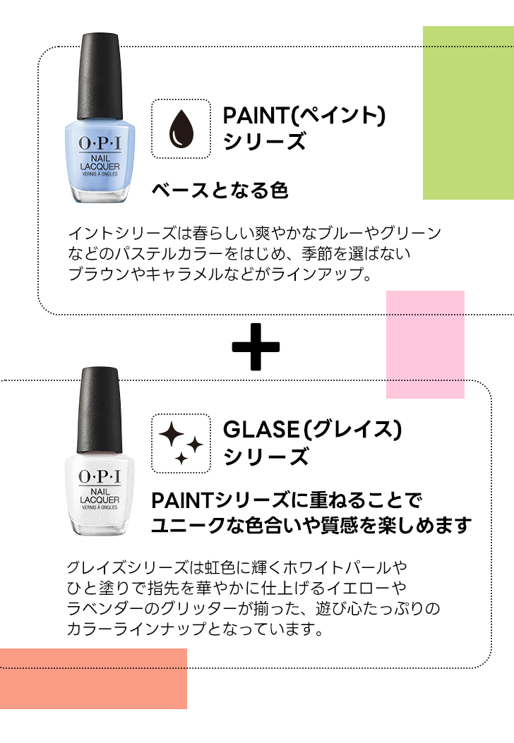 2024 年春、OPI がお届けする「OPI Your Way (オーピーアイ ユア ウエイ)」は思うままに自分らしさを表現できる、とびっきり素敵なカラーコレクションです。コレクションはベースの色となる PAINT(ペイント) シリーズと、それに重ねることでユニークな色合いや質感を楽しめる GLAZE(グレイズ) シリーズで構成されています。ペイントシリーズは春らしい爽やかなブルーやグリーンなどのパステルカラーをはじめ、季節を選ばないブラウンやキャラメルなどがラインアップ。一方のグレイズシリーズは虹色に輝くホワイトパールやひと塗りで指先を華やかに仕上げるイエローやラベンダーのグリッターが揃った、遊び心たっぷりのカラーラインナップとなっています。