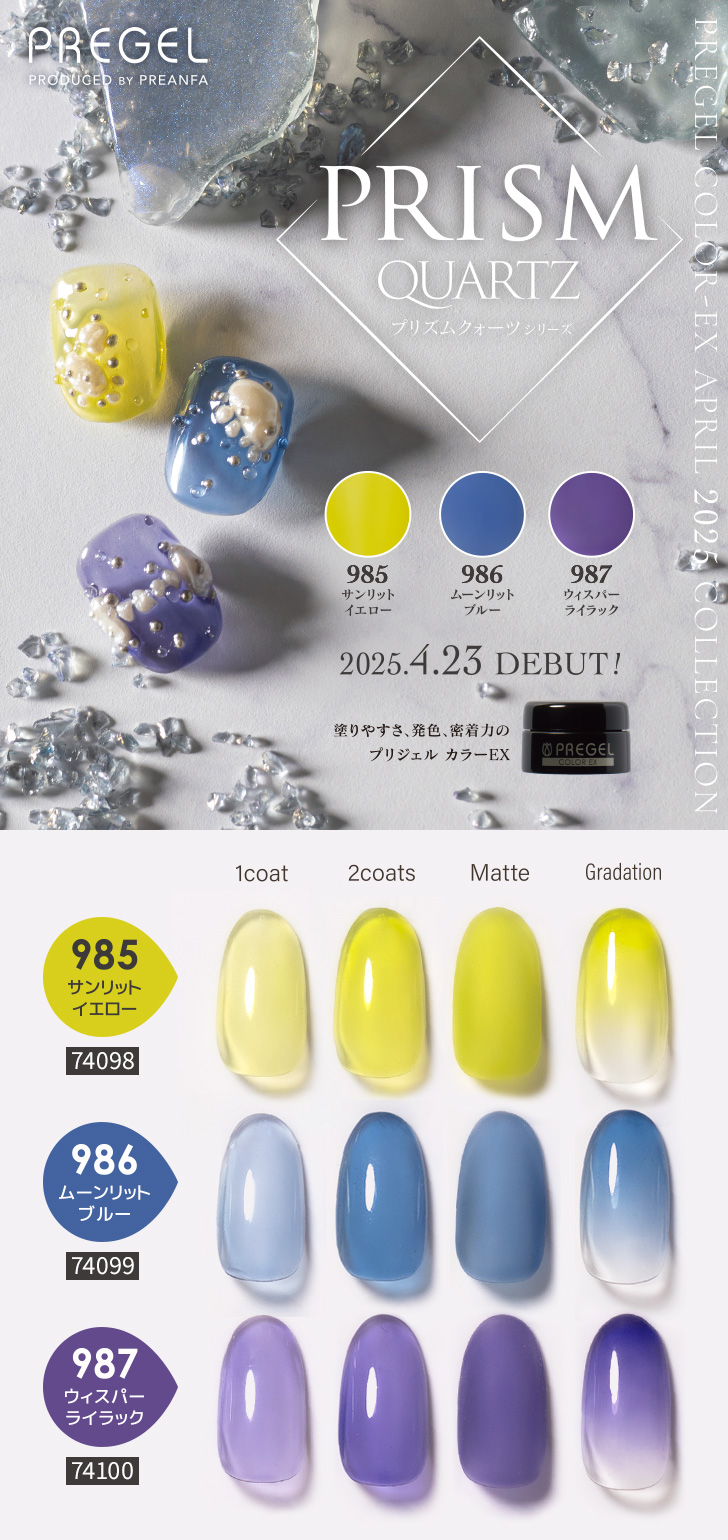 オンラインショップ プリジェル カラーEX PG-CE985購入画面へ プリジェル カラーEX PG-CE986購入画面へ プリジェル カラーEX PG-CE987購入画面へ プリジェル カラーEX プリズムクォーツシリーズ3g×3色セット購入画面へ
