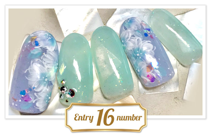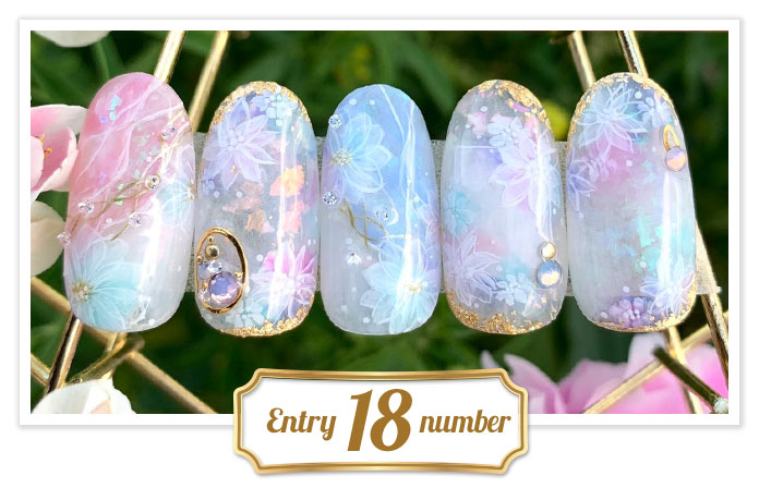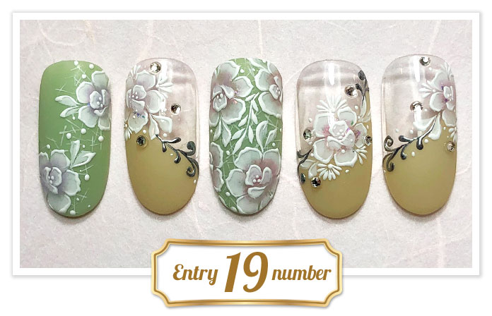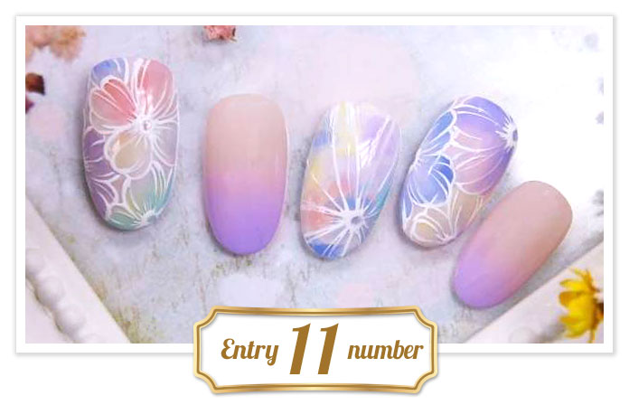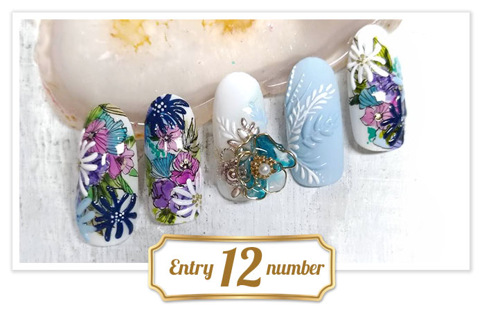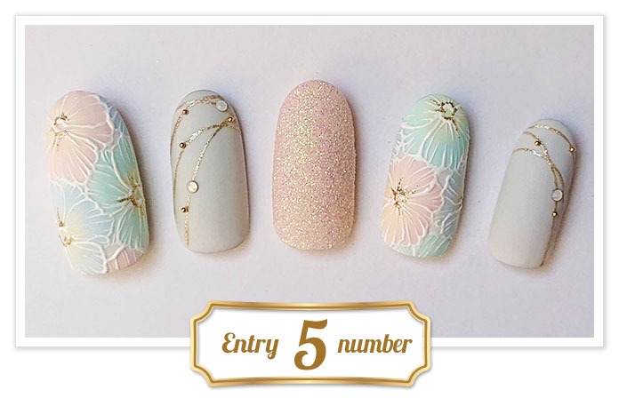 ペールカラーからジューンブライドを連想し、アンギュラー花とレースをレリーフ技法を活用し奥行きを出して描いてみました。花の中心にダズリングパウダーを使用し、華やかさを感じさせるように工夫しました。