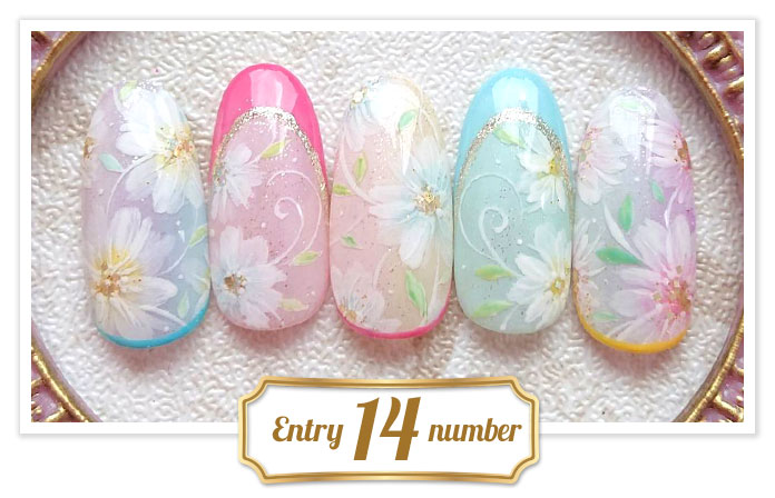 ペールトーンの淡く柔らかいカラーのベースにふんわり優しいお花を描きました。淡いカラーでぼんやりしすぎないよう、フレンチとキワのラインでメリハリをつけました。見ているだけで心踊るような色合いをイメージしました。