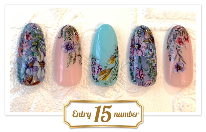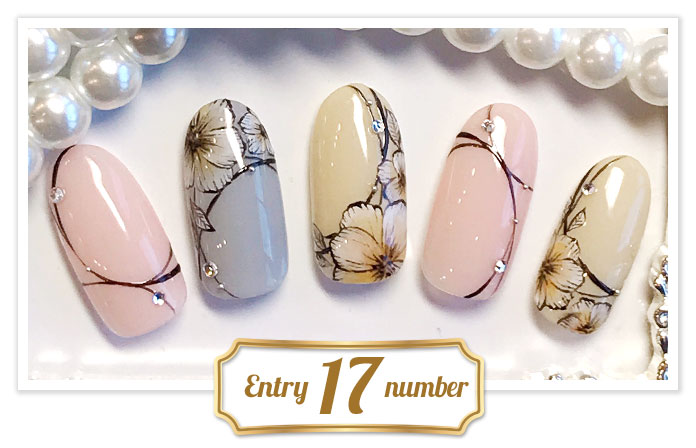 ガーリーなペールトーンに繊細なボタニカルフラワーをたっぷり描き込みました。ベースはペールトーン3色でストーンなどを乗せずシンプルに。奥行きと立体感を大事に仕上げました。