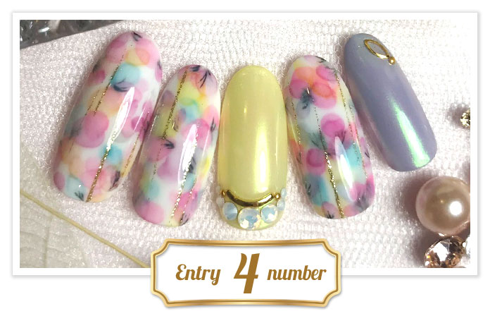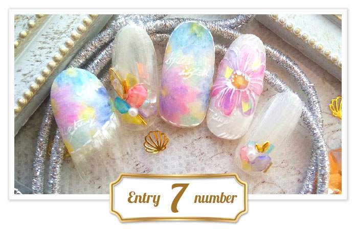 水彩での優しい色味とジェルアートのコントラストでお花の華やかさを表現しました。