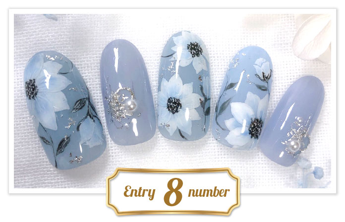 ペールトーンでも少しくすませて肌馴染みのいいブルーにしました。サロンワークでもスピーディーに施術できる花柄で、ブライダルにもおすすめしたいアートです。