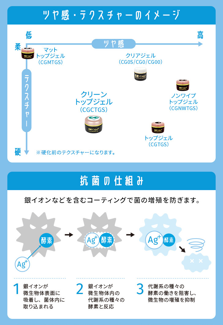 カルジェルの仕上げに使用するトップジェルに抗菌作用をプラス!オシャレを楽しみながら、ジェルをつけている期間菌の繁殖を防ぎ、常に清潔な爪先をキープできる新商品です。
