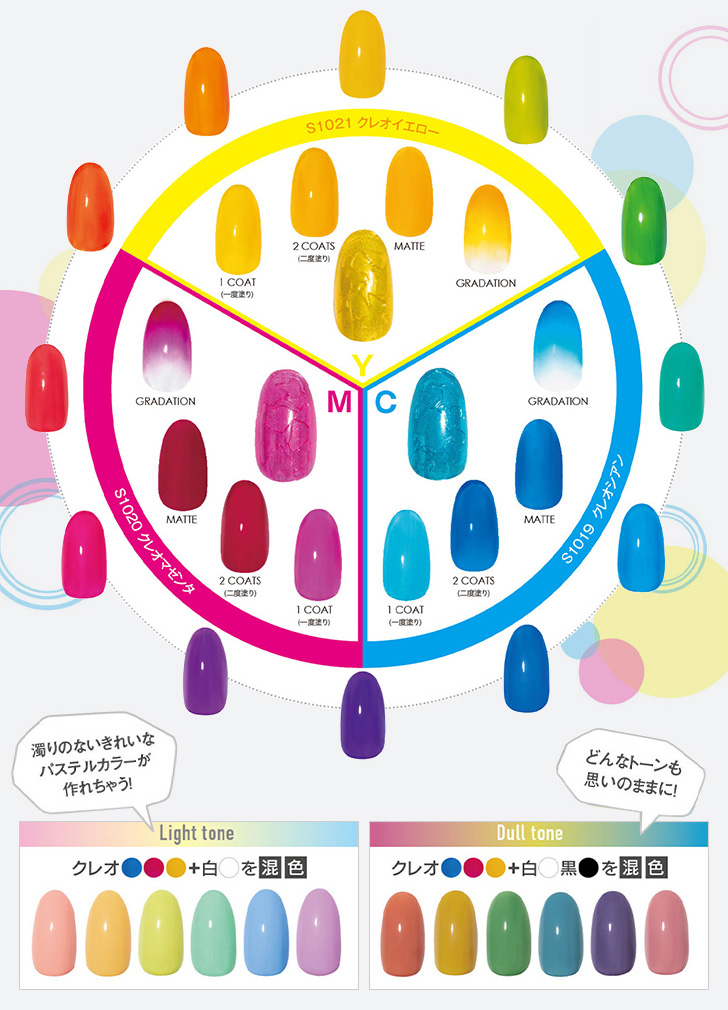 CREO(クレオ)はラテン語で創造、造るなどの意味です。配合次第でどんな色にでもなれる色の原色。混色しても濁りの出ない『純色』を高濃度の顔料で再現しました。手持ちのカラーに混ぜて使うも良し。そのまま使うも良し。クレオ3色で下図のチャートのような鮮やかな濁りのないカラーを再現することができるので、単品より3色セットで混色を楽しむことをオススメします。