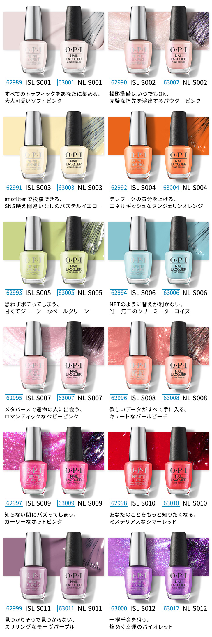 OPIの2023年スプリングコレクションのテーマは、Me, Myself and OPI(ミー、マイセルフ アンド オーピーアイ)。カラーに限界がないデジタル空間、メタバースの世界にインスパイアされた最旬のコレクションです。マット、パール、シマー(ラメ)といった異なる質感で構成されたカラーは、遊び心溢れるパステルカラーをはじめ、自分らしさを思う存分に表現できる12色です。なりたい自分になれる“カラーバース”の扉を開けよう!