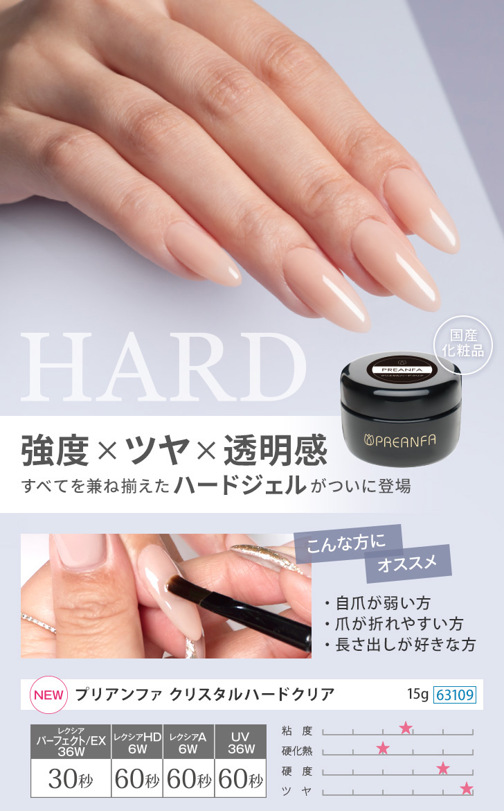 プリアンファよりハードジェルが新登場!硬化後の黄味を抑え、透明感に優れており抜群なツヤ感で仕上げのコーティングとしてもおすすめです。また、爪が割れやすい方などにも強度がプラスされてしっかり補強できます。1cm程度の長さ出しも可能です。