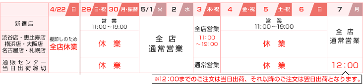 ゴールデンウィークの営業日のご案内 HOME お知らせ ゴールデンウィークの営業日のご案内 ゴールデンウィークは下記の日程で営業いたします。 ※通常営業時間:通販10:00~18:00 / 店舗10:00~19:00