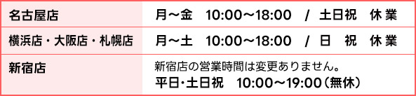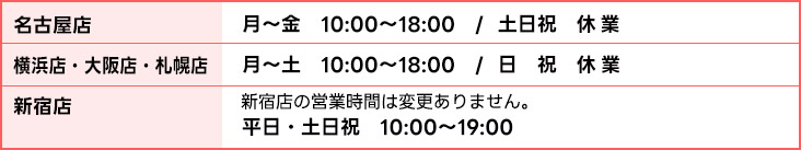 店舗営業時間変更のお知らせ HOME お知らせ 店舗営業時間変更のお知らせ 2/13(月)より、横浜店・大阪店・札幌店・名古屋店の閉店時間を19:00から18:00に短縮いたします。 2/18(土)より、名古屋店は土曜日を定休日とさせていただきます。